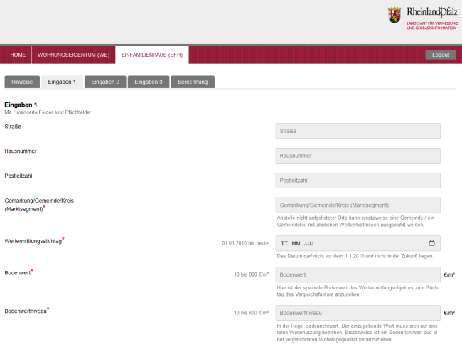 Online Zugriff zum Immobilienwertrechner für die überschlägige Vergleichswertermittlung von mit Einfamilienwohnhäusern (EFH) bebauten Grundstücken sowie Wohnungseigentum (WE)