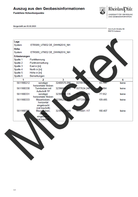 Auszug aus dem amtlichen Nachweis der Festpunkte für Rheinland-Pfalz